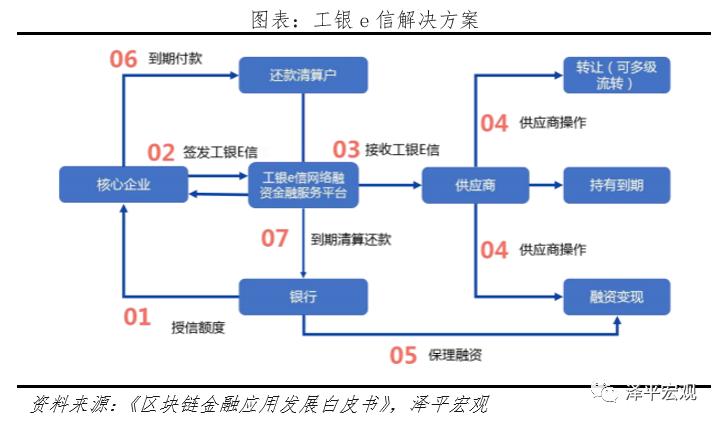 其中最为关键的是区块链技术实现的信用共享,具体来看,数据方面,通过将业务流程中的四流(信息流、商流、物流和资金流)与融资信息上链,利用区块链不可篡改性,提升数据可信度;业务方面,将核心企业的票据、授信额度、应收应付等转化为数字凭证,利用区块链可溯源性,实现信用有效传导,同时通过智能合约可实现数字凭证的多级拆分和流转,有效提升金融机构风控效率,降低中小企业融资难度。目前已有较多区块链结合供应链实践,如工银e信、农行e链贷等,主要用于应收款项、库存融资等方面。以工银e信为例,其是一种可流转、可融资、可拆分的电子付款承诺函,可在平台上自由转让、融资、质押等,实现银行资金的全产业链支持。