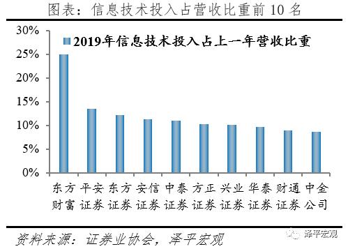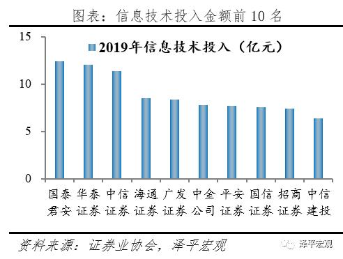 1)大型综合类券商通过自建团队、合作开发等方式,注重培育自主研发能力。国泰君安成立数字金融部、华泰证券成立数字化运营部、中金与腾讯成立合资技术公司,2019年,国泰君安、华泰证券、中信证券信息技术投入位列前三,投入规模分别为12.4亿元、12.0亿元和11.4亿元。
