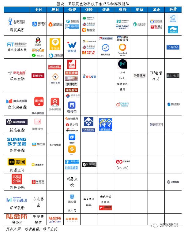 互联网巨头通过丰富场景、海量用户、网络信息技术渗透到支付、借贷、投资、保险等各个金融服务,形成金融科技头部平台。根据毕马威2019年全球金融科技100强榜单(Fintech100),中国共7家公司列入前50强,其中蚂蚁集团、京东数科、度小满金融等分别列第1、3、6位,是我国互联网金融科技平台类企业的代表。我们选取蚂蚁、腾讯、京东、百度、新浪、苏宁、美团、网易、字节跳动、陆金所共10家互联网平台作为研究样本。