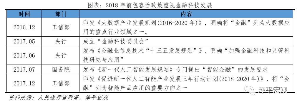 2018年前,高度重视金融科技,包容性政策为主。2017年5月,央行成立专门“金融科技委员会”,定位于“金融科技工作的研究、规划与统筹协调”,标志着金融科技行业迎来监管层面的重要支持与规范。7月,国务院印发《新一代人工智能发展规划》专门提出了“智能金融”的发展要求,12月,工信部印发《促进新一代人工智能产业发展三年行动计划(2018-2020年)》,将“金融”列为智能产品应用的重要方向之一。