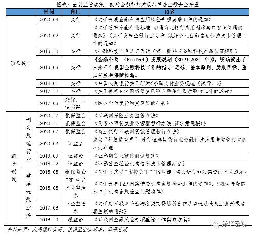 2020年以来,金融科技在经历爆发式增长后,行业规范化和标准化的缺失,系统性风险累积,引起监管高度重视。吸取P2P事后监管教训,监管层提前预判风险,出台政策整治互联网贷款、网络小贷等,约谈金融科技巨头,平衡创新与风险的关系。