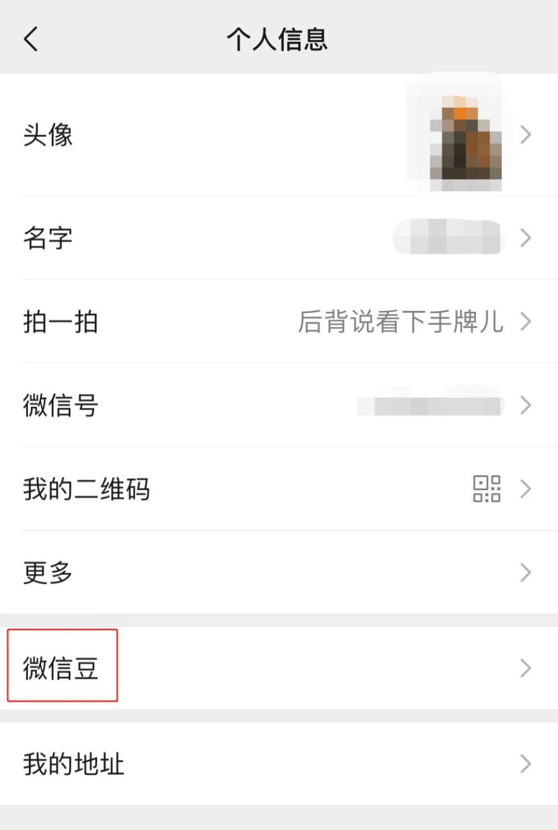在【 我 】这一栏里点击头像进入个人信息,就可以看到列表里多出一个微信豆。