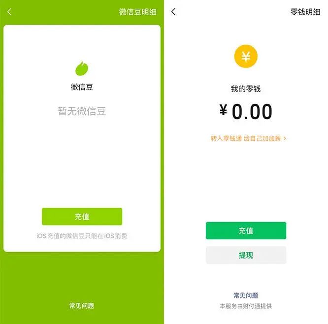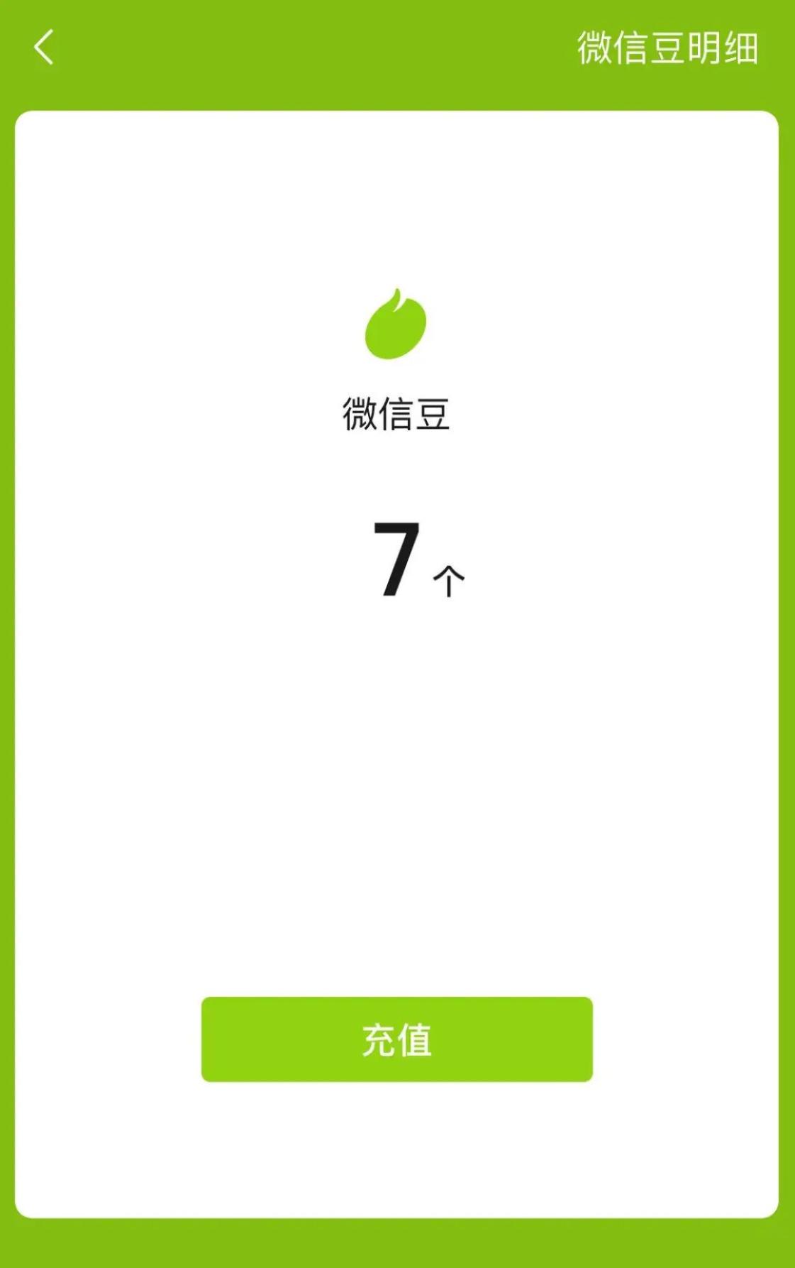 微信豆的界面布局和零钱界面有些相似,都是屏幕中央有充值按钮,右上角可以查看消费明细。