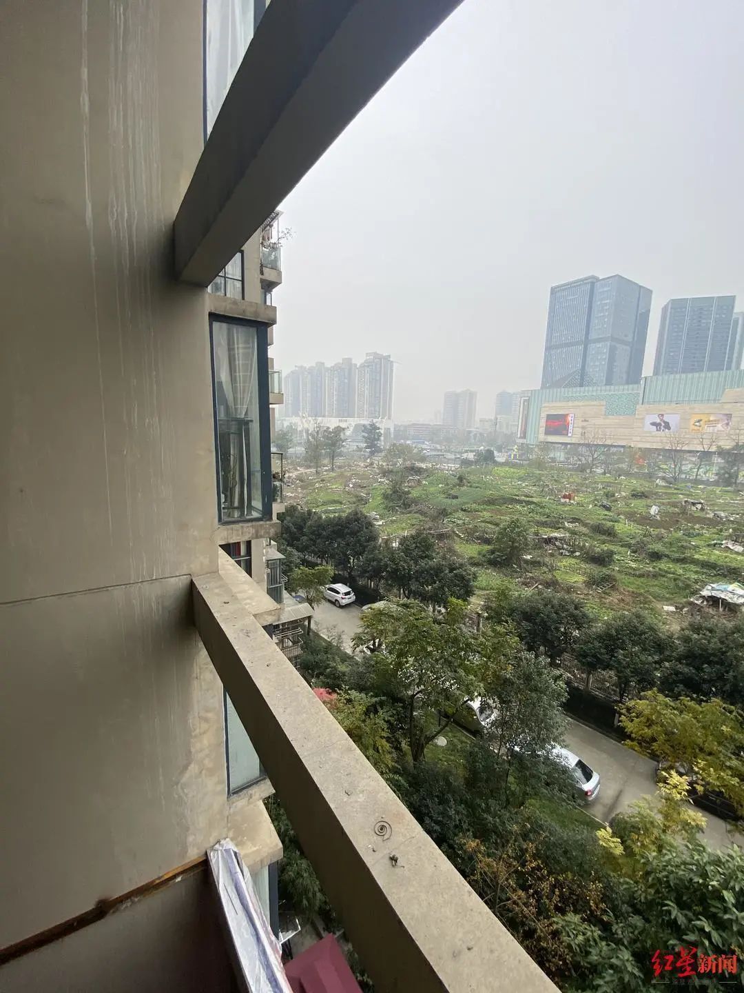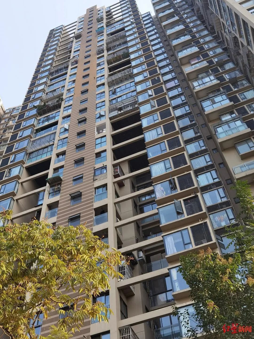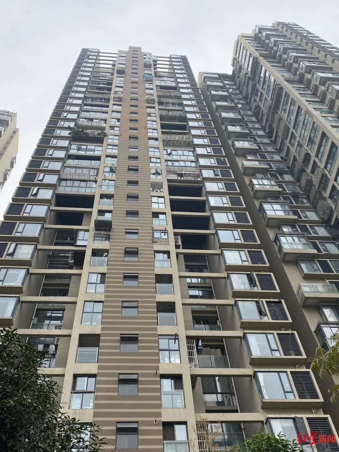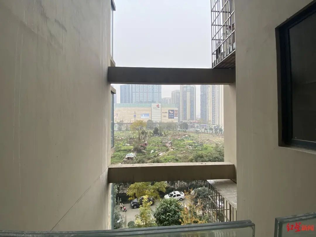 12月24日,红星新闻记者来到顶峰水岸汇景小区看到,该小区楼栋外立面的内凹处有多根横梁,每层楼均有一根,横梁离房屋有一米到两米的距离,与房屋之间形成了一块镂空的空间。
