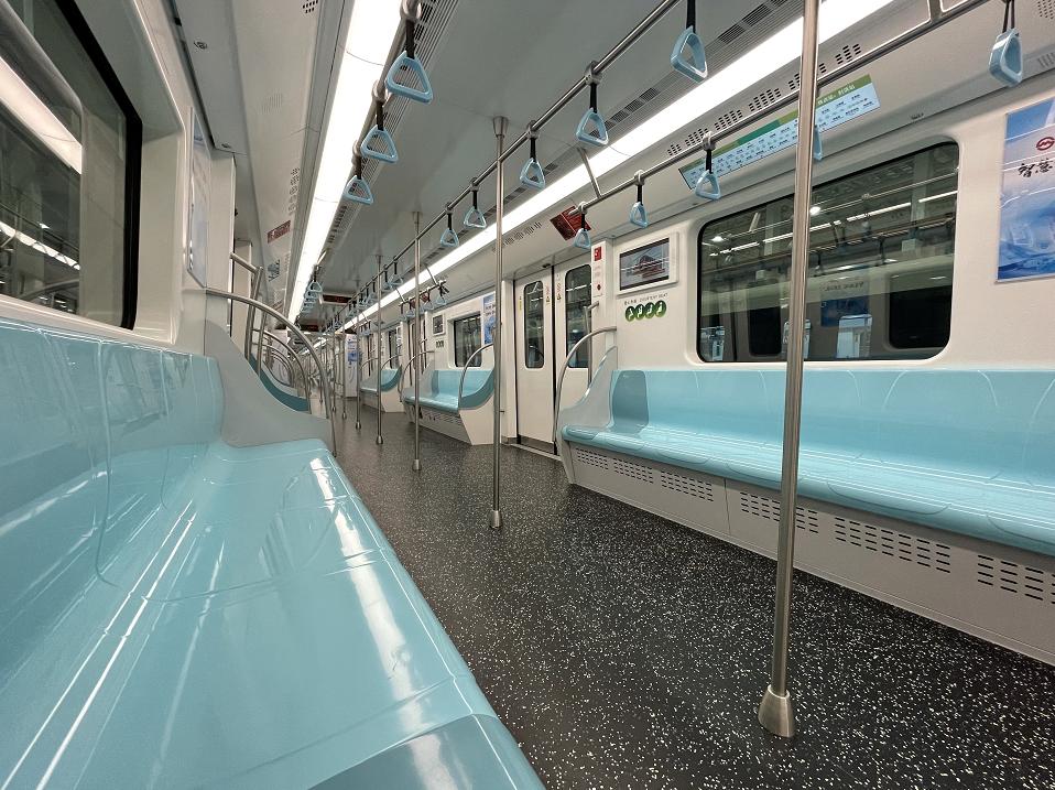 在建中的上海轨道交通14号线是上海地铁除1号线、2号线以外的又一条8节编组A型车线路,同样采用全自动驾驶(GOA4)技术。线路西起嘉定封浜,东至浦东桂桥路,贯穿上海城区市中心,是连接上海东西部的一条轨道交通“大动脉”。2019年9月10日,上海地铁14号线首列新车抵沪。该项目列车由中车浦镇设计制造,共计49列。全新开放式司机室的设计,相比于一般6节编组的列车,单列车载客量可增加800余人。内装设计简约大气并搭配了由官方认证的“孔雀蓝”唯美色调。