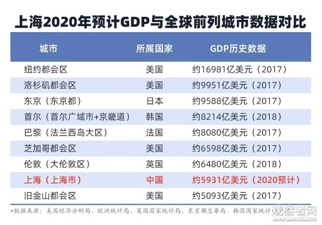 与国际城市相比,上海GDP与大伦敦区、旧金山都会区等不相上下。不过,离纽约都会区、洛杉矶都会区和东京都还有一定距离。