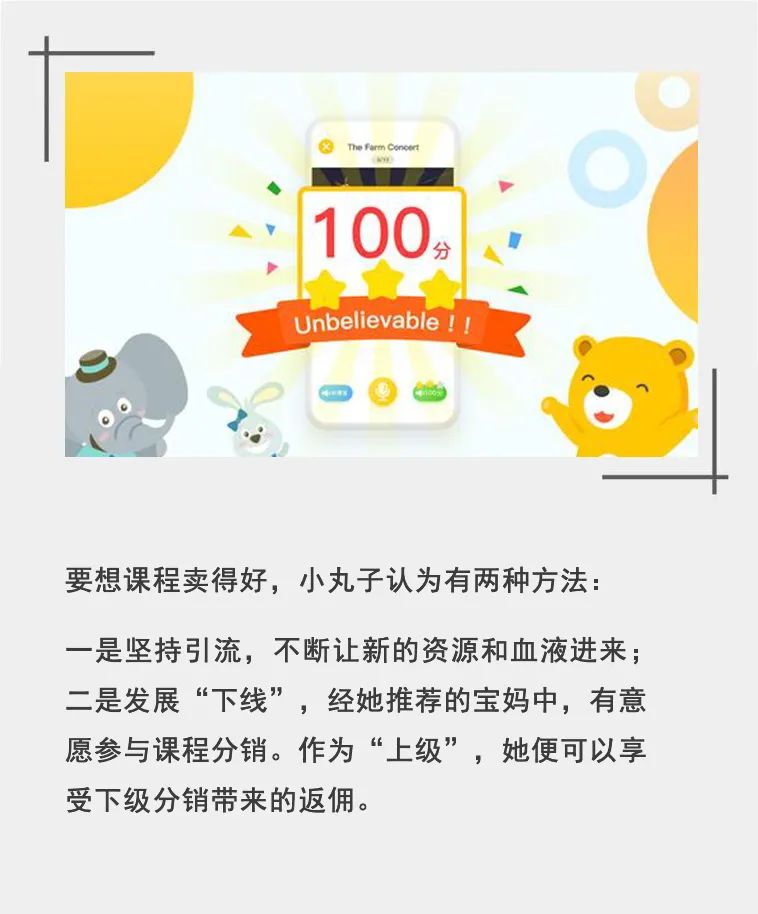 要想课程卖好,小丸子认为有两种方法:一是坚持引流,不断有新的资源和血液进来,二是发展“下线”,经她推荐的宝妈,有意愿参与课程分销。作为“上级”,她便可以享受下级分销的返佣。