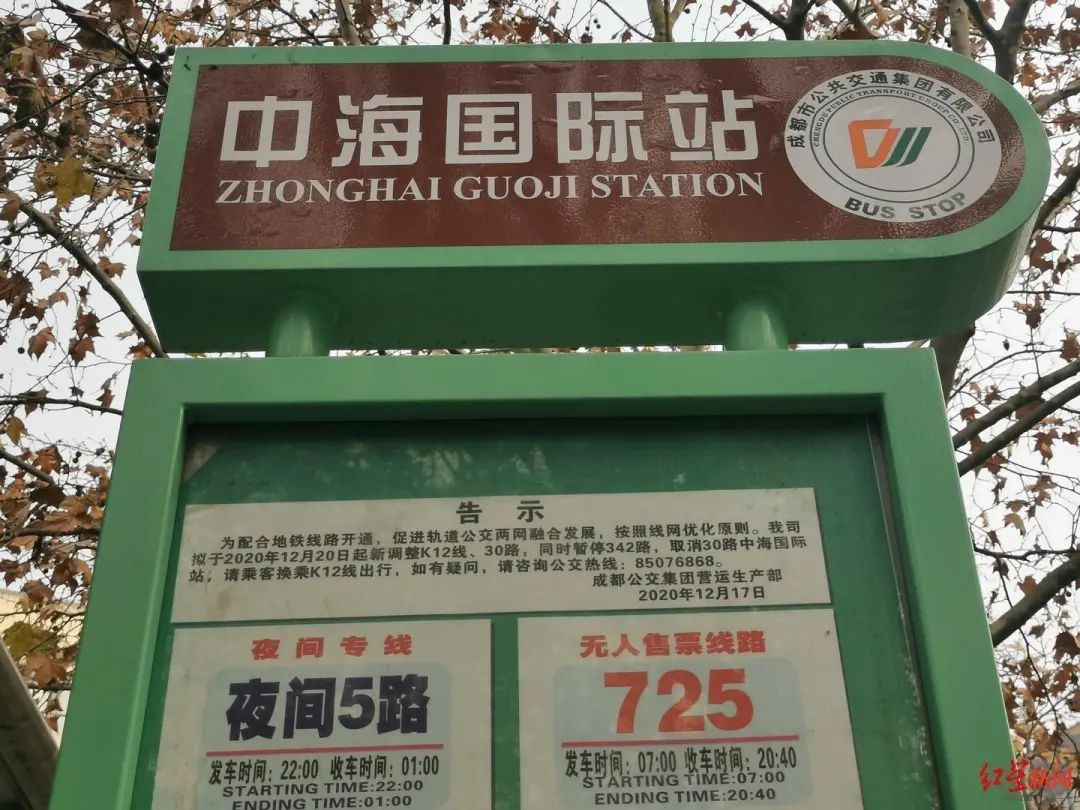 然而,这趟为居民们服务了十来年的公交线路却结束运营了。根据成都市公交集团的公告,12月20日起,新调整K12路、30路,取消30路中海国际社区站,同时暂停342路。其中,30路线路调整为西御街至高新西区公交站,取消了中海国际等站,前往中海国际的乘客需在何家三队附近下车,步行一段距离到社区。K12路由金沙公交站-成都东客站(东广场)调整为中海国际-成都东客站(东广场)。