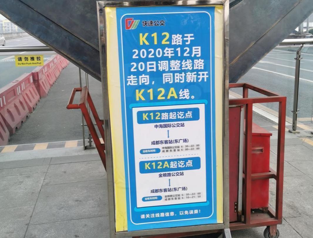 (二)调整了快速公交K12线,起讫点由成都东客站(东广场)—金沙公交站调整为成都东客站(东广场)—中海国际站),满足了中海国际社区居民快速到达二环沿途、东客站、高新南区等区域的出行需求。