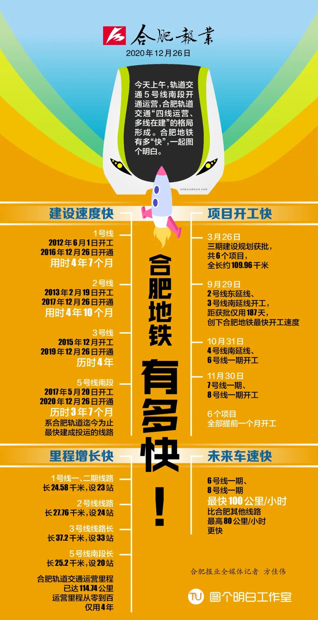 2017年5月20日,5号线南段开工,2020年12月26日,开通。前后用时1300余天,成为合肥轨道迄今为止最快建成投运的线路。