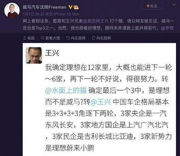 今年1月,投资了理想汽车的美团创始人王兴在微博上公开表示,未来的汽车行业格局会是央企、地方国企、民企和新势力的组合,造车新势力中,最终能胜出的是理想、蔚来和小鹏。偏偏把威马排除在外。