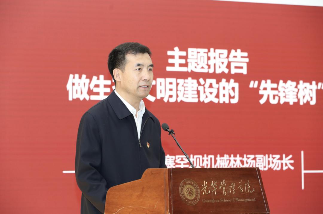 为深刻学习领会习近平总书记关于加强生态文明建设重要战略思想的丰富内涵和重大意义,总结推广塞罕坝林场建设的成功经验,大力弘扬塞罕坝精神,近日,由光华管理学院、信息科学技术学院、中国语言文学系、历史学系、国际关系学院等五院联合团校塞罕坝机械林场“时代楷模”先进事迹报告会在光华管理学院1号楼301报告厅成功举办,河北省塞罕坝机械林场副场长张建华、第一代务林人陈彦娴、党办主任赵云国、宣传科科员程李美等塞罕坝“时代楷模”宣讲团成员为与会师生讲述塞罕坝三代务林人的创业故事。五院基层团校200余名学员齐聚一堂,聆听林场建设者的光辉事迹。河北省林业和草原局副局长吴京、信息中心主任王振一,北京大学光华管理学院党委副书记滕飞,校团委副书记(兼)、光华管理学院团委书记鞠晓,信息科学技术学院团委书记王绍鑫、中国语言文学系团委书记张辰、历史学系团委书记刘东奇等出席会议。
