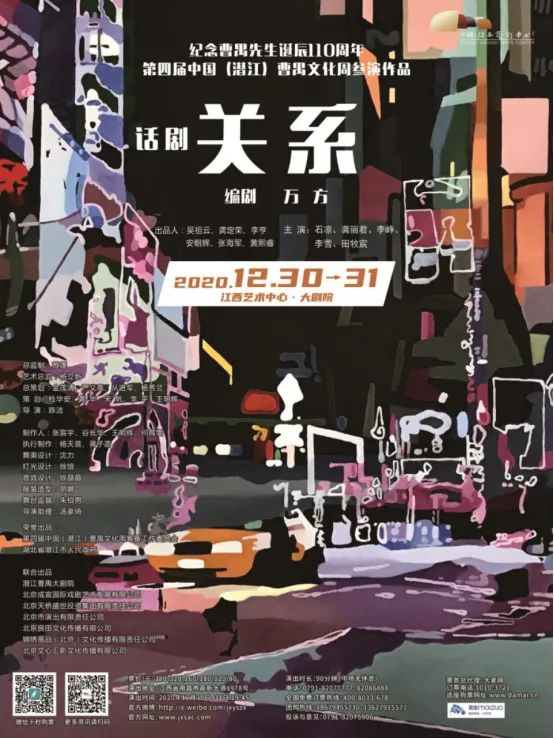 戏剧家曹禺女儿万方创作的话剧《关系》,该剧自2009年首演以来已演出超过百场。该剧剧本曾获北京市庆祝新中国成立60周年文艺作品佳作奖。此次为纪念曹禺先生诞辰110周年全新复排。