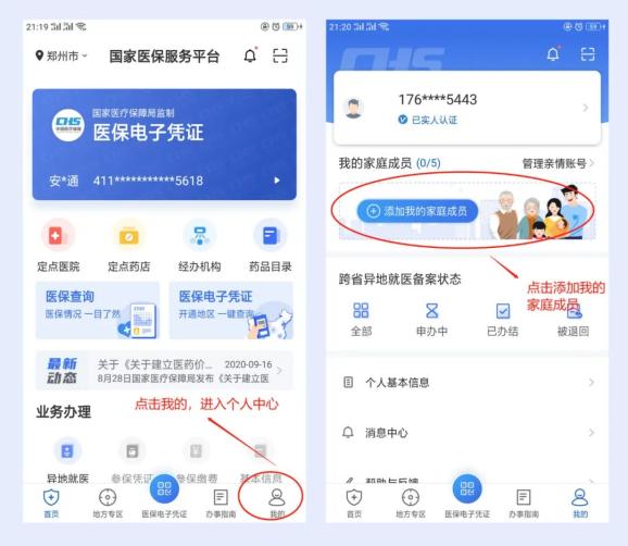 完成登录后,点击底部菜单栏【我的】进入个人中心页面,在【我的家庭成员】版块点击图标“+”添加亲情账户。