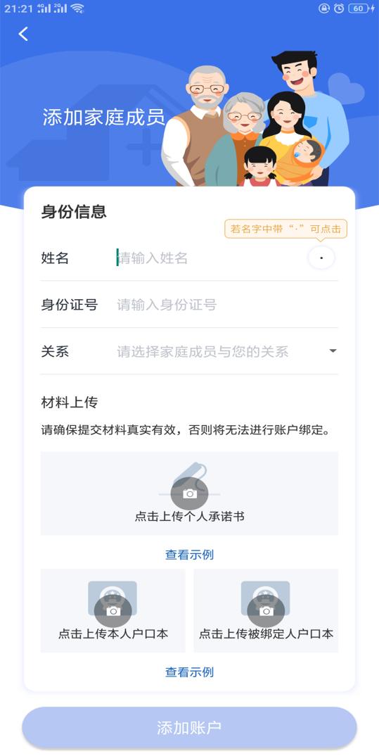 请在此页面准确填写家庭成员的姓名、身份证号,选择家庭成员与您的关系。确认上述信息准确无误后,点击相机图标并按照示例上传个人承诺书、本人户口本及被绑定人户口本。