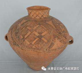 文字说明:侈口,竖颈,鼓肩,斜腹,小平底,腹有双耳,饰黑红彩,颈饰网格纹,肩腹施黑红相间的锯齿纹组成的圆圈纹,内填菱格。