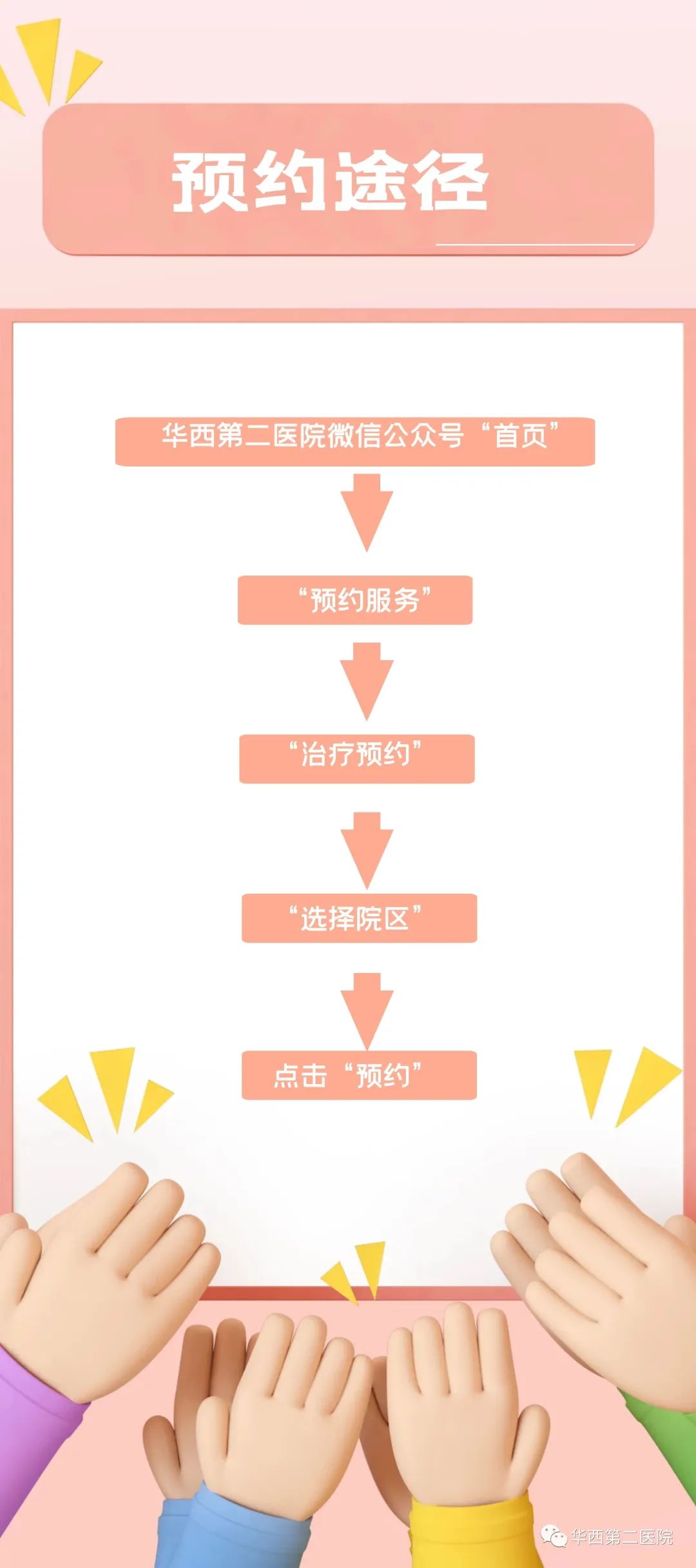 如果是首次预约,需先到儿童保健科现场办理预约服务,注意带齐儿童保健卡及儿童实名制电子就诊卡(实体卡请绑定于医院微信公众号上),同时要保证儿童保健卡和就诊卡上儿童姓名一致。使用手机的预约途径也很简单,点击华西第二医院微信公众号首页,再依次点预约服务、治疗预约、选择院区、预约,即可完成。