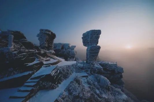 历来,梵净山四季有惊喜,春天是漫山遍野的杜鹃花,夏天是山林间的葱翠,秋天是海拔赋予的色彩斑斓。而冬天,这里则是一个白雪童话王国。尤其雪后,你将会看到的是群山披玉,银装素裹,云海升腾……如梦如幻的世界。