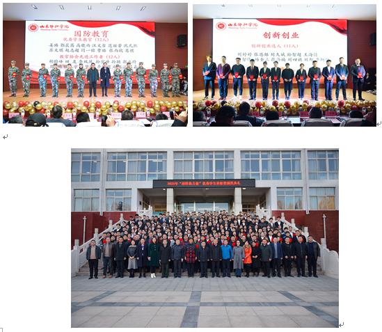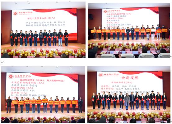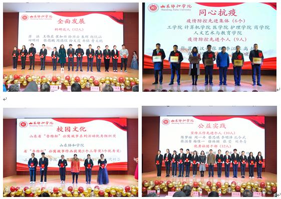 “榜样的力量”年度表彰活动由“学习科研”“全面发展”“同心抗疫”“校园文化”“公益实践”“国防教育”“创新创业”七大主题篇章组成。在学习科研篇章中,颁发了省政府奖学金、国家奖学金和年度十大学生人物奖;在全面发展篇章中,表彰了省级优秀班集体、省级优秀学生和优秀学生干部、科研达人;在同心抗疫篇章中,表彰了疫情防控先进集体、先进工作者;在校园文化篇章中,颁发了山东省“鲁维杯”公寓故事三等奖和优秀奖、全国校园歌手大赛第三名、年度十大文体之星奖;在公益实践篇章中,表彰了先进基层团学组织、优秀社团和先进个人;在国防教育篇章中,颁发了军事技能竞赛团队奖、优秀奖;在创新创业篇章中,表彰了年度创新创业达人奖。表彰会上,校外优秀学子发来感谢母校培养的祝福视频,获得全场观众的深深敬佩与热烈掌声。