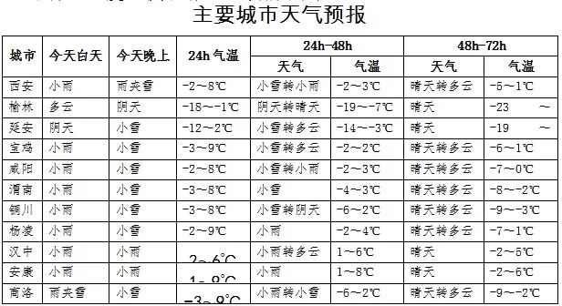 29日:全省阴天转多云,陕北南部部分、关中北部有小雪,关中南部雨夹雪或小到中雪,陕南小到中雨转雨夹雪或中雪,秦巴山区部分地方有大雪、局地暴雪。日平均气温陕北下降8-10度,关中、陕南下降6-8度。陕北、关中北部和陕南东部有6级偏北风。