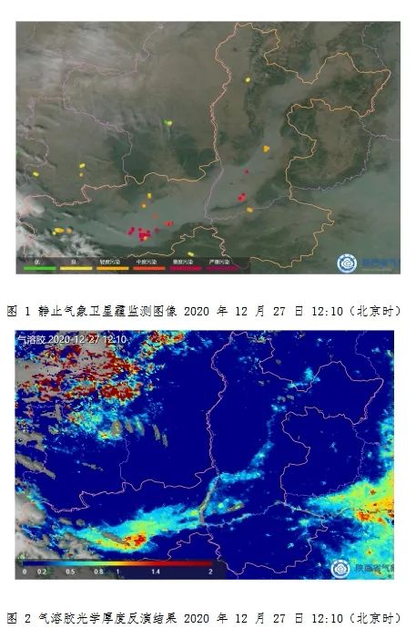 27 日 12:10静止气象卫星监测显示:汾渭平原局地出现重度霾(图 1) ,卫星可视的霾区主要分布于陕西省西安市和咸阳市, 以卫星反演的气溶胶光学厚度作为参考,上述地区污染程度以中度为主,局地达到重度(图 2)。受霾天气影响,上述区域空气质量、 大气能见度下降,包茂、福银、连霍、京昆、沪陕等高速公路的交通运输受到不利影响。
