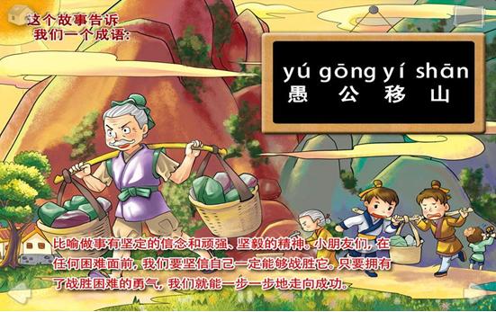 故事中,有个年近90的老人叫愚公,在山的正对面居住。他苦于山区的阻塞,就和家人商量:“咱们尽力挖平险峻的大山,使道路方便出行,好吗?”大家纷纷表示赞同。于是,愚公率领儿孙开始挖山。河湾上的智叟讥笑愚公说:“就凭你的年纪,又能把险峻的大山怎么样呢?”愚公长叹:“即使我死了,还有儿子在,儿子又生孙子,孙子又生儿子,子子孙孙无穷无尽,可是山却不会增高加大,还怕挖不平吗?”天帝被愚公的诚心感动,命令神将背走了那两座山。