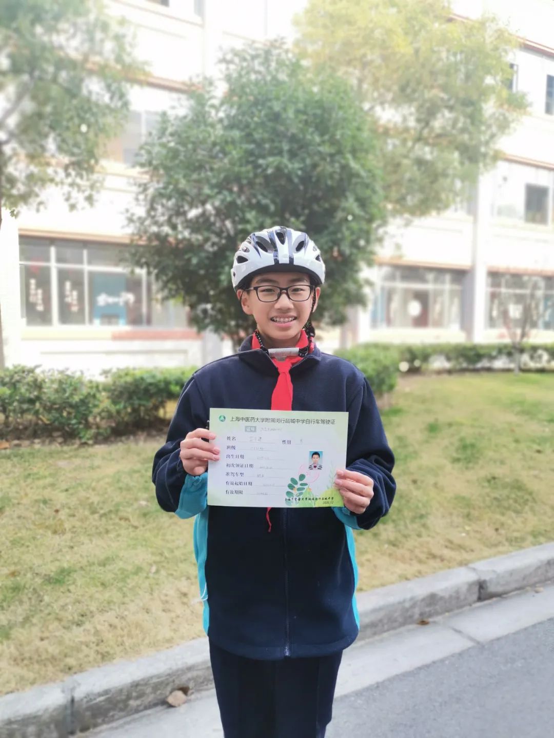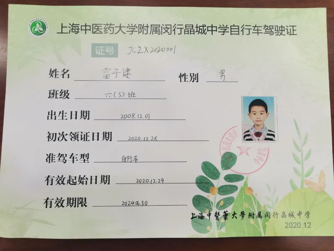 经过严格的考核之后,学校会颁发个性化定制的《上海中医药大学附属闵行晶城中学自行车驾驶证》。