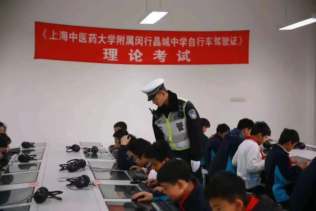 “学生考证不仅能够掌握交通安全知识,保障他们安全出行,还能培养他们的规则意识、自我管理能力。”上海中医药大学附属闵行晶城中学德育中心主任刘鹏老师介绍,通过和梅陇派出所合作,学校推出了考自行车驾驶证的活动。