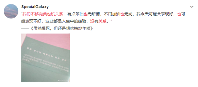 SUPER JUNIOR队长利特在《旋律书屋》节目中也推荐了这本书,他说自己上综艺节目很有压力,好像带着一种使命,一定要拿到好的位置,后来很长时间陷入抑郁,他就在想,我这样活着是对的吗?以前一直贪心想要的东西,对我来说真的是重要的吗?