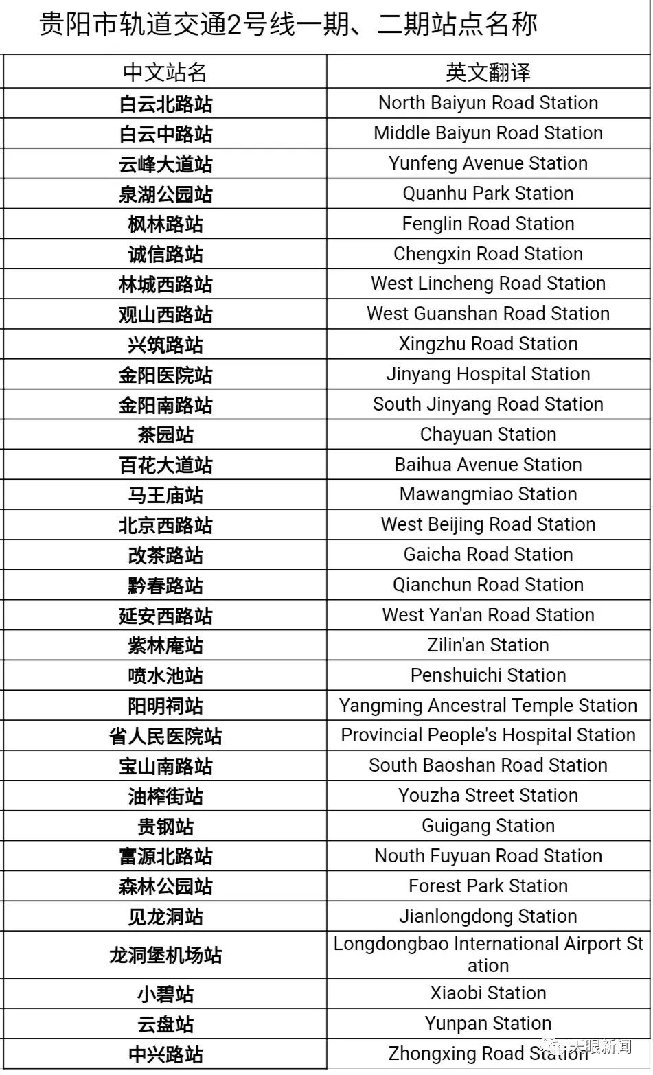 贵阳市轨道交通2号线一期、二期站点名称