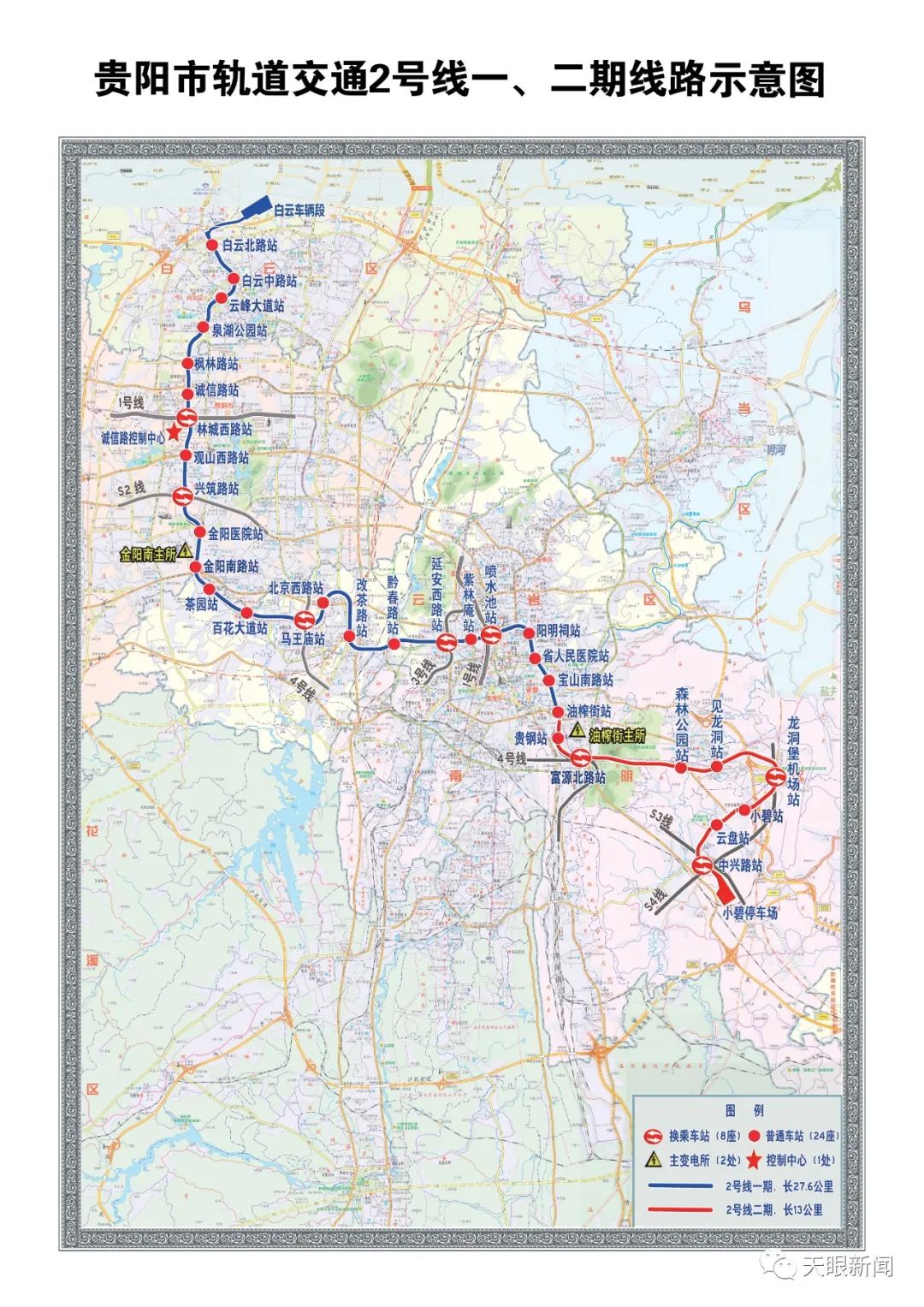 贵阳轨道交通2号线一期和二期连接白云区、观山湖区、云岩区、南明区和双龙航空港经济区,全长40.6公里,设车站32座,其中地下站30座,高架站2座,最大站间距3206米(富源北路站~森林公园站),最小站间距634米(紫林庵站~喷水池站)。设1个车辆段、1个停车场、2座主变电所,控制中心与1号线共用。其中,2号线一期工程从白云北路站至油榨街站,线路全长27.6公里,共24个车站;2号线二期工程从油榨街站至中兴路站,线路全长13公里,共8个车站。