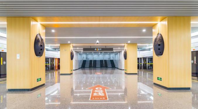 乐鼓模型融入承重柱中、琵琶轮廓为木纹底绘彩增韵、东汉击鼓说唱陶俑图案点缀墙面……中国传统音乐元素与站域特点耦合,“传统国韵”文化篇章由此而生;在“西洋律动”篇章中,通过对西洋乐器进行解构并与空间重组,加上“音符”和“五线谱”符号的适当运用,立体的构筑成8号线充满音乐律动的车站空间。
