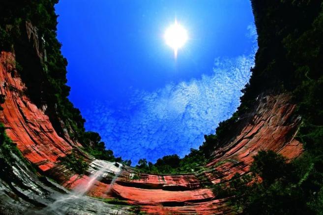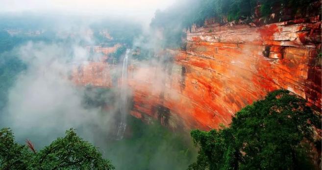 佛光岩 | 在一面赤色天书前,一缕白瀑从天而降,犹如赤云中飞身而下的小白龙,飘洒俊逸~
