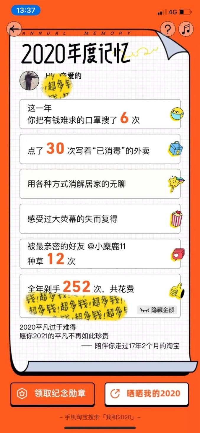 现在,只要打开淘宝,搜索“我和2020”,首页就会跳出你的年度账单。