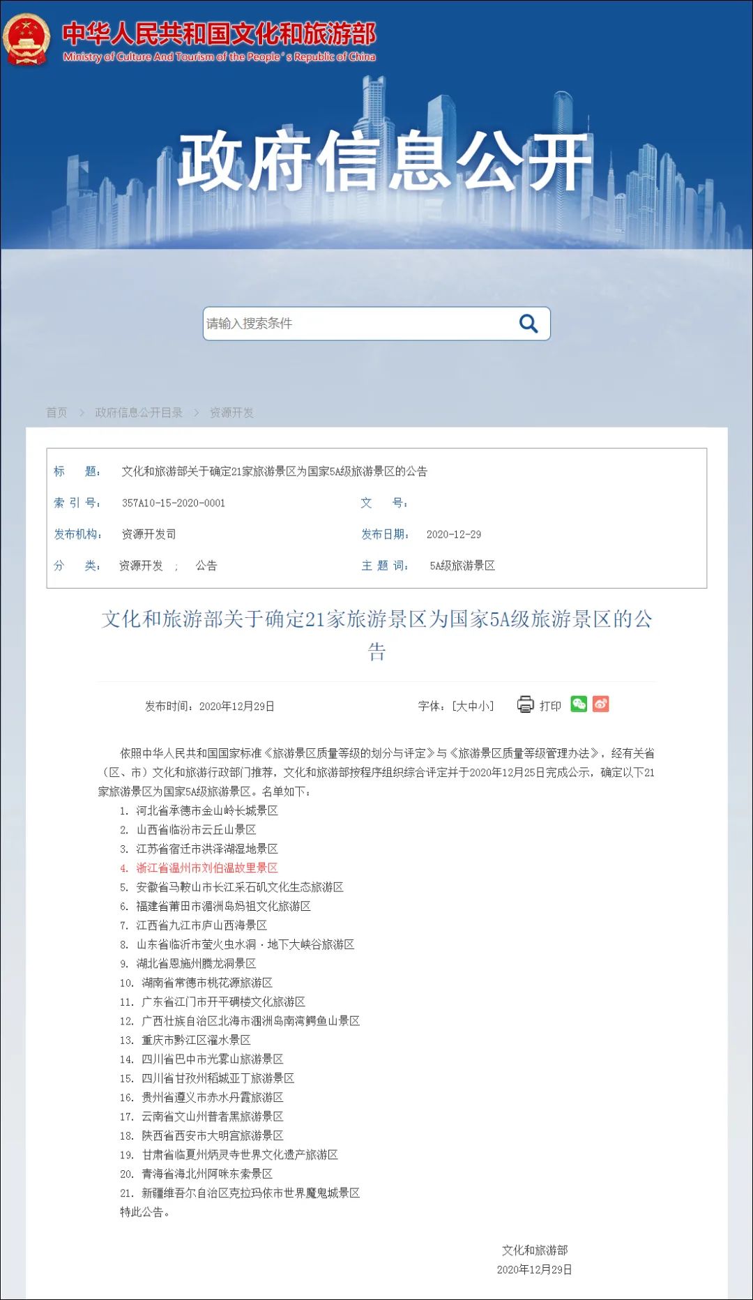 2020年12月29日,文化和旅游部发布公告,经综合评定并完成公示,确定21家旅游景区为国家5A级旅游景区,我市文成刘伯温故里景区上榜。