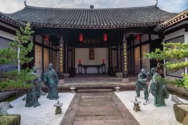 往后是正厅,中间是刘基,两侧是刘基两个儿子刘琏、刘璟塑像,庄严肃穆。正厅同样也悬挂着很多的匾额,每一块匾额都歌颂着刘基的丰功伟绩聪颖智慧。