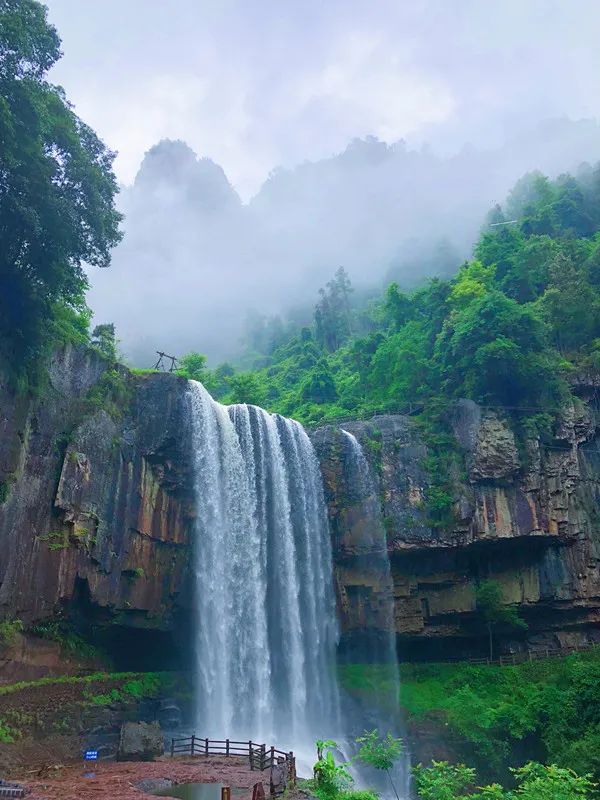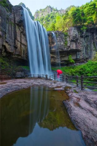 再往上走,来到了百丈一漈前,沿着游步道便是一漈之下的观瀑亭,在那里,能近距离观赏久负盛名的“中华第一高瀑”。水似飞珠溅玉,飘纱凝虹;声如怒雷惊涛,撼山震地,蔚为壮观。