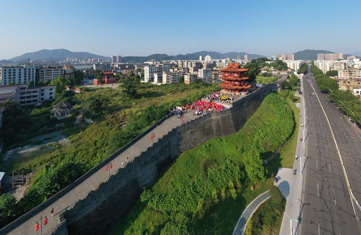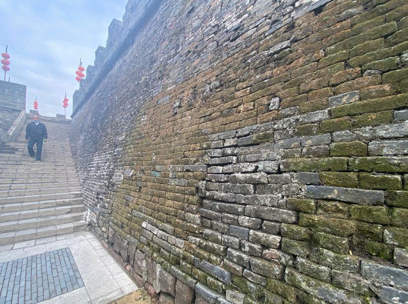 ▲朝天门一侧城墙上,砌有连片宋砖。西江日报全媒体记者 赖小琴 摄