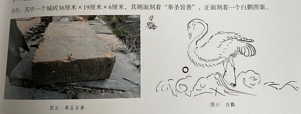 ▲“奉圣旨善”砖及其正面的白鹳图案。西江日报全媒体记者 赖小琴翻拍。