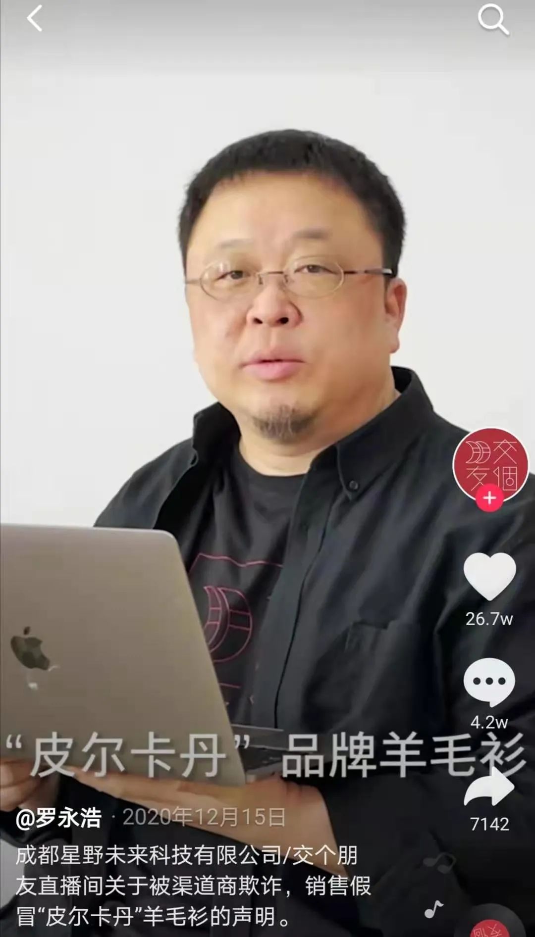 罗永浩抱着笔记本电脑,向网友宣读,交个朋友直播间销售“皮尔卡丹”品牌羊毛衫为假货的声明,向各位消费者道歉,并解释了出售问题商品的原因。罗永浩将这则致歉的短视频上传到了个人的抖音号,得到了20多万点赞。
