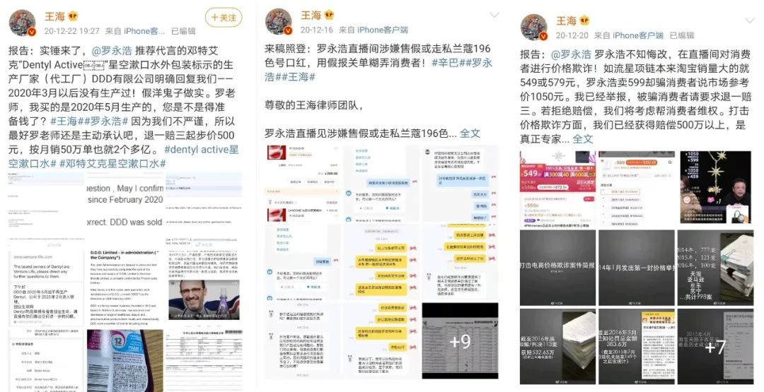 打完辛巴,王海就盯上了罗永浩。2020年12月13日,王海在微博喊话罗永浩,“交个朋友直播间售卖的漱口水效果用洗牙视频所表现,涉嫌虚假宣传,得准备钱退一赔三,起步价500元。”