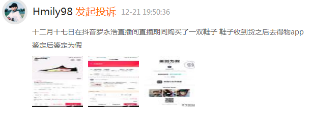12月21日,一名消费者在黑猫投诉找罗永浩维权,其在罗永浩直播中购买了一双RVG X STM潮鞋,外观与日本Revenge X Storm潮鞋相似,但鞋子做工却很粗糙,鞋底周围凹凸不平、刺绣字样大小不一,经过在得物app上鉴定,显示为假货。