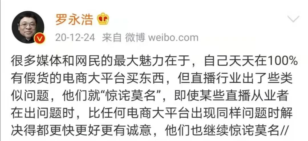 面对网友指责,罗永浩表达了自己的压力:“很多媒体和网民的最大魅力在于,自己天天在100%有假货的电商大平台买东西,但直播行业出了些类似问题,他们就‘惊诧莫名’,即使某些直播从业者在出问题时,比任何电商大平台出现同样问题时解决得都更快更好更有诚意,他们也继续‘惊诧莫名’。”