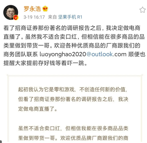 电子烟的前途渺茫,罗永浩只能重新寻找风口,直到2020年3月,他说:“我决定做电商直播了”,原因是“看了招商证券那份著名的研究报告”。报告里说,2019年直播电商总GMV(成交总额)约超3000亿,未来有望达到万亿体量。