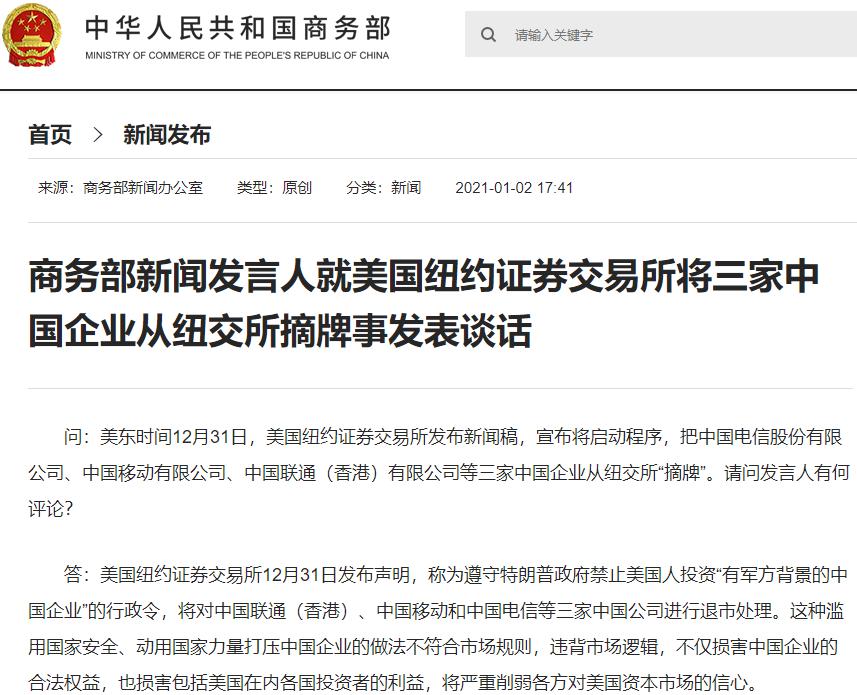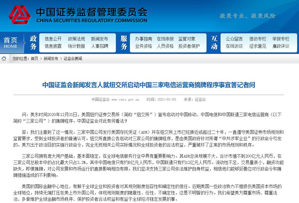 美东时间2020年12月31日,纽交所宣布启动对中国移动、中国电信和中国联通三家电信运营商等三家公司的摘牌程序。中国证监会表示,三家中国公司发行美国存托凭证(ADR)并在纽交所上市已经接近或超过二十年,一直遵守美国证券市场规则和监管要求,受到全球投资者的普遍认可。纽交所直接公告启动对三家公司的摘牌程序,是由美国政府针对所谓“中共涉军企业”的行政命令引发的。美方出于政治目的实施行政命令,完全无视相关公司实际情况和全球投资者的合法权益,严重破坏了正常的市场规则和秩序。