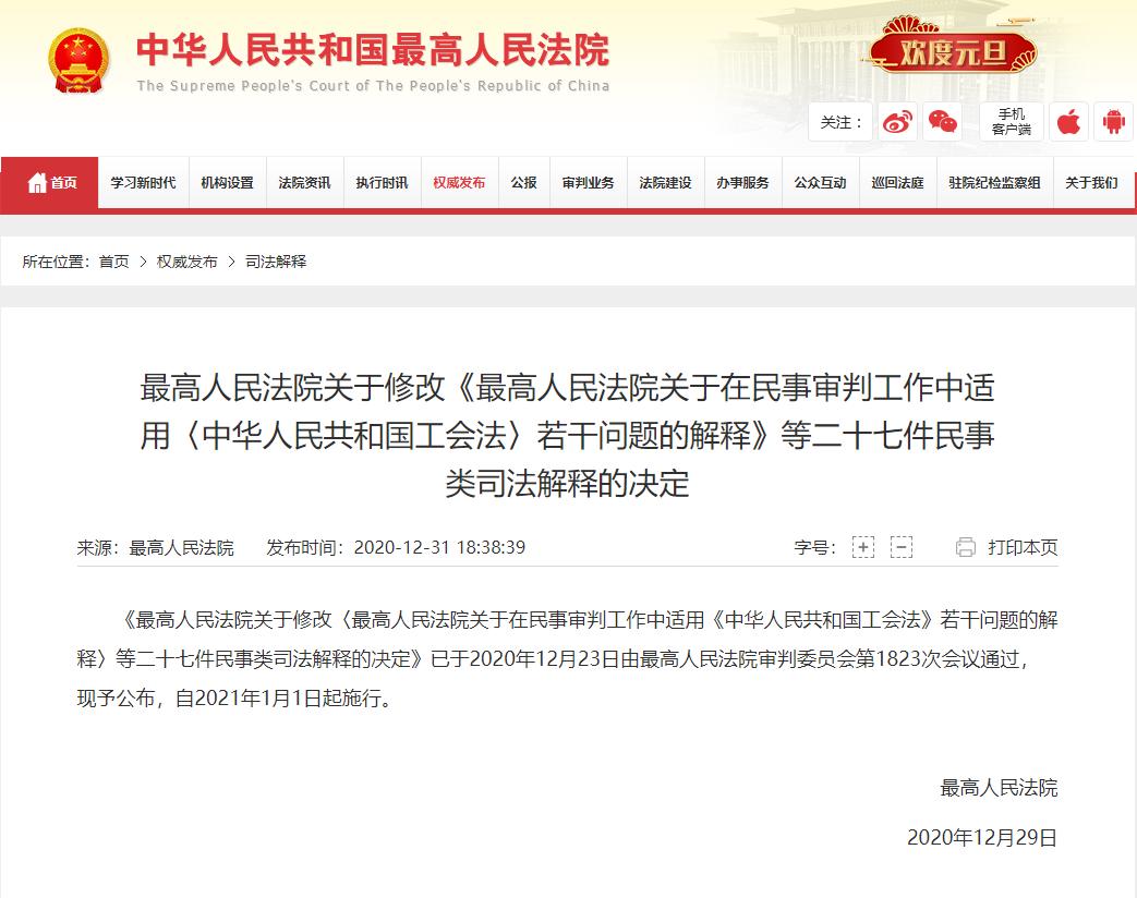 原标题:《最新!这些已做修改!最高人民法院发布修改27件民事类司法解释的决定!》