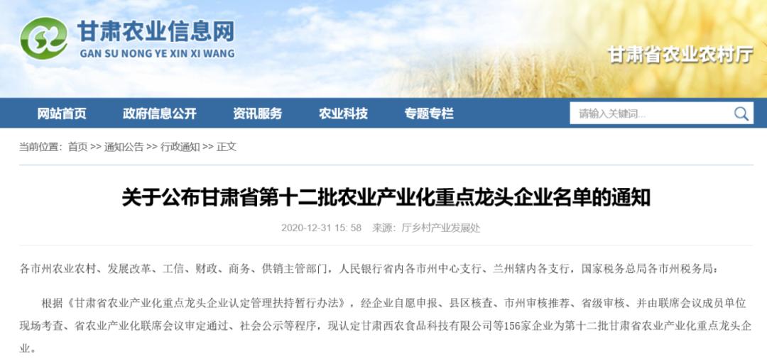 根据《甘肃省农业产业化重点龙头企业认定管理扶持暂行办法》,经企业自愿申报、县区核查、市州审核推荐、省级审核、并由联席会议成员单位现场考查、省农业产业化联席会议审定通过、社会公示等程序,现认定甘肃西农食品科技有限公司等156家企业为第十二批甘肃省农业产业化重点龙头企业。