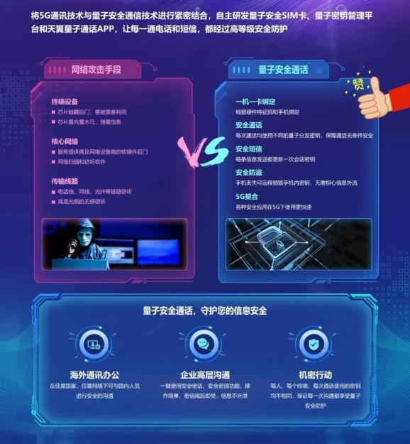 “量子密话”是用量子信息技术来保护通话的安全服务。作为国内首款将5G与量子信息技术紧密结合的移动通信产品,“量子密话”最主要的特点是充分利用量子随机数及量子密钥分发机制来生成认证密钥及通话密钥,其密钥具有真随机性。