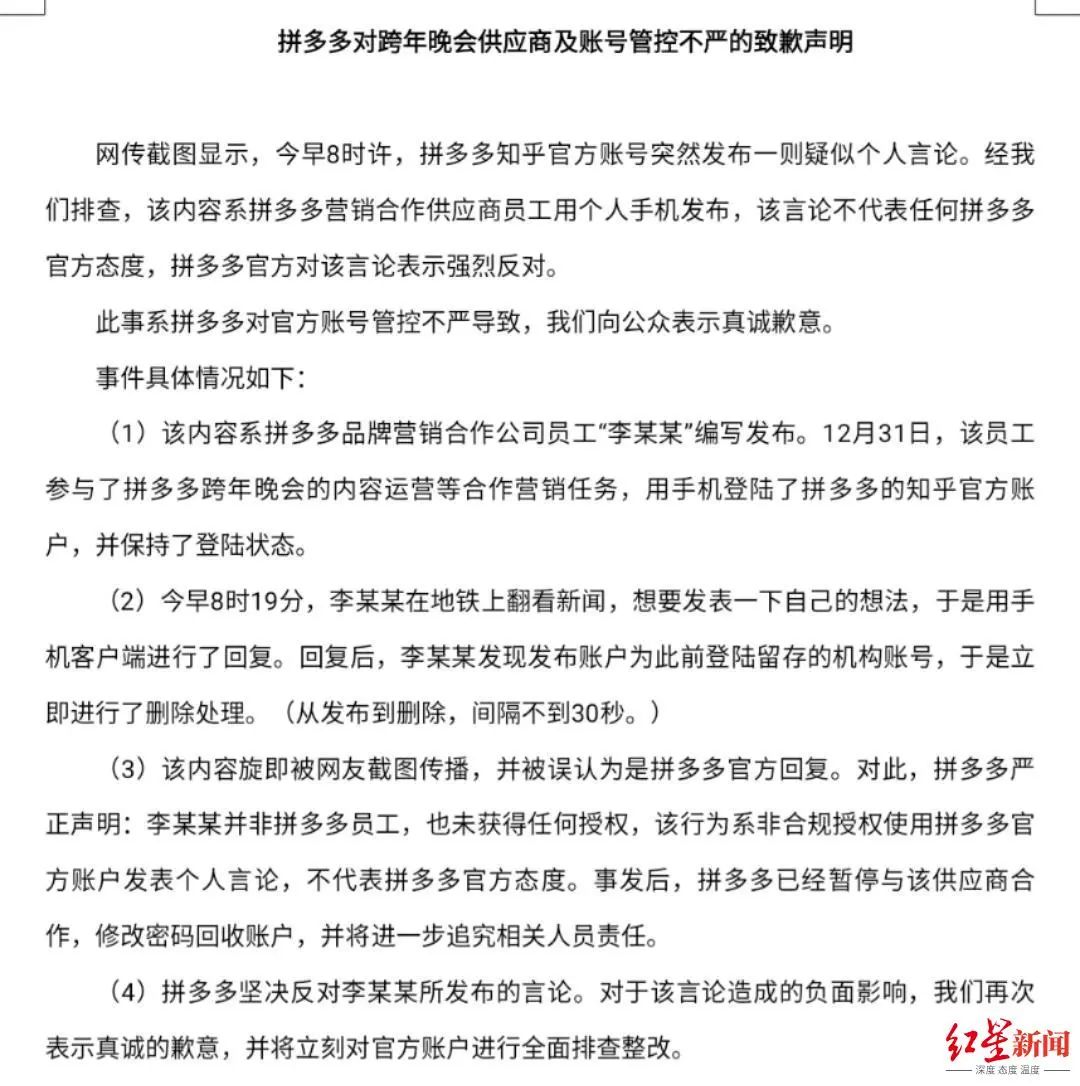 新闻回顾:知乎回应!拼多多道歉!据红星新闻此前报道,1月4日,拼多多员工凌晨意外去世消息引发网友关注。红星新闻记者从女孩的朋友、校友等多人处了解到,该女孩2019年从西安邮电大学毕业,后入职拼多多,人已经去世。
