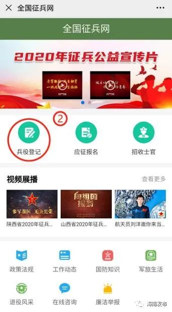1.填写信息。有两种方式:一种是直接登录全国征兵网(网址:http://www.gfbzb.gov.cn)点击“兵役登记”选项,进行实名注册并真实、完整填写个人基本信息;另一种是关注并进入“海南国防”微信公众号,选择“征兵工作”菜单栏,点击“兵役登记”选项,进入“全国征兵网”页面进行登记。